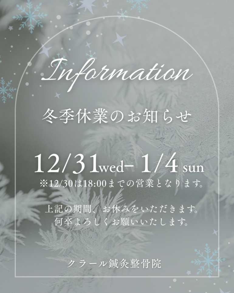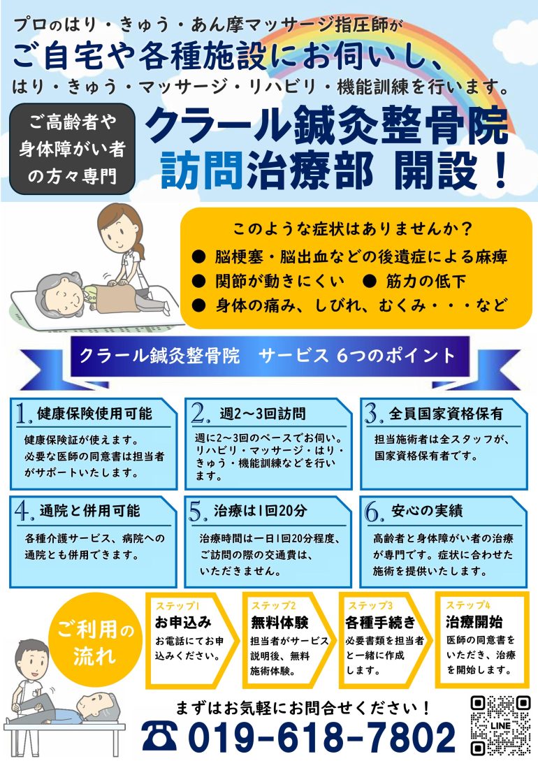 頭痛・肩こりや腰痛などの慢性症状、ぎっくり腰などの急性症状、交通事故によるむちうち症、視力回復サポート・眼精疲労回復、美容鍼・逆子治療・不妊治療・更年期障害等、お体のお悩みは何でも♪盛岡市のクラール鍼灸整骨院へ